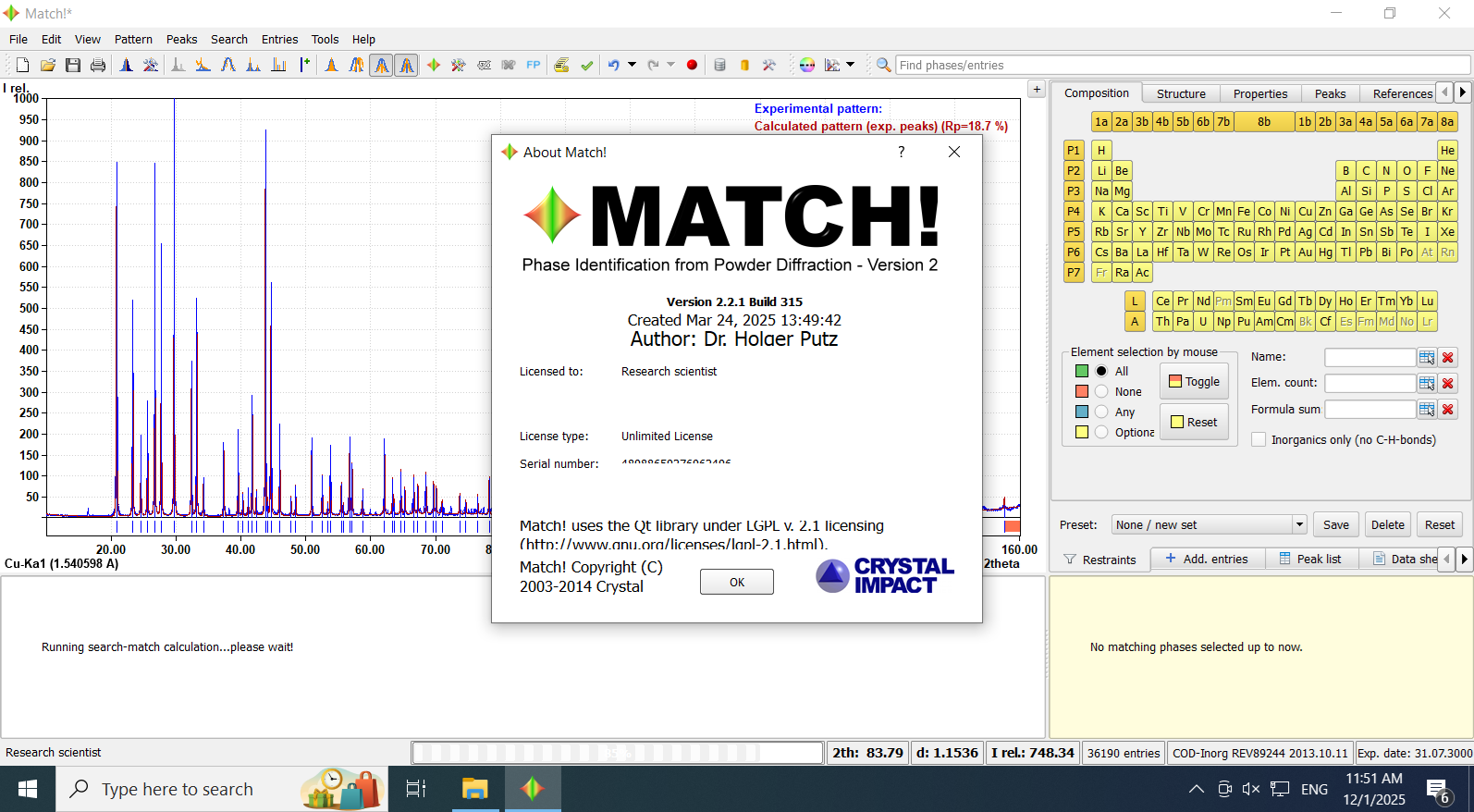 Crystal Impact Match 2.2.1 is a powerful phase identification software designed for X-ray powder diffraction analysis. It compares experimental diffraction patterns with reference databases to quickly and accurately identify crystalline phases. Built for researchers, material scientists, chemists, and laboratory professionals, Match 2.2.1 delivers a reliable and efficient solution for phase analysis in academic and industrial applications.