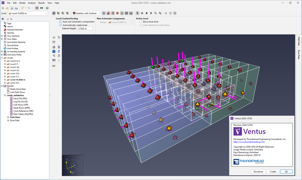 Thunderhead Ventus 2024.1.0702 is designed to provide a pressurization simulation for smoke control analysis. The simulation is performed by CONTAM, an open-source application maintained and developed by NIST.